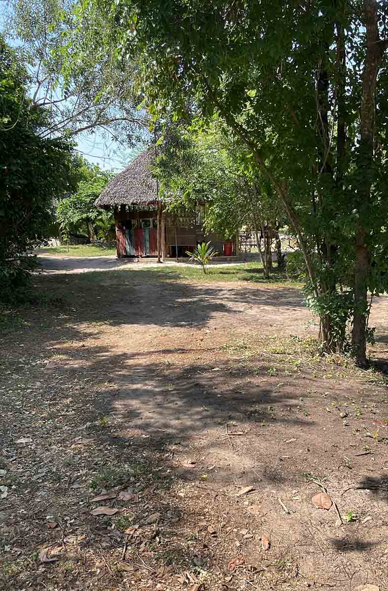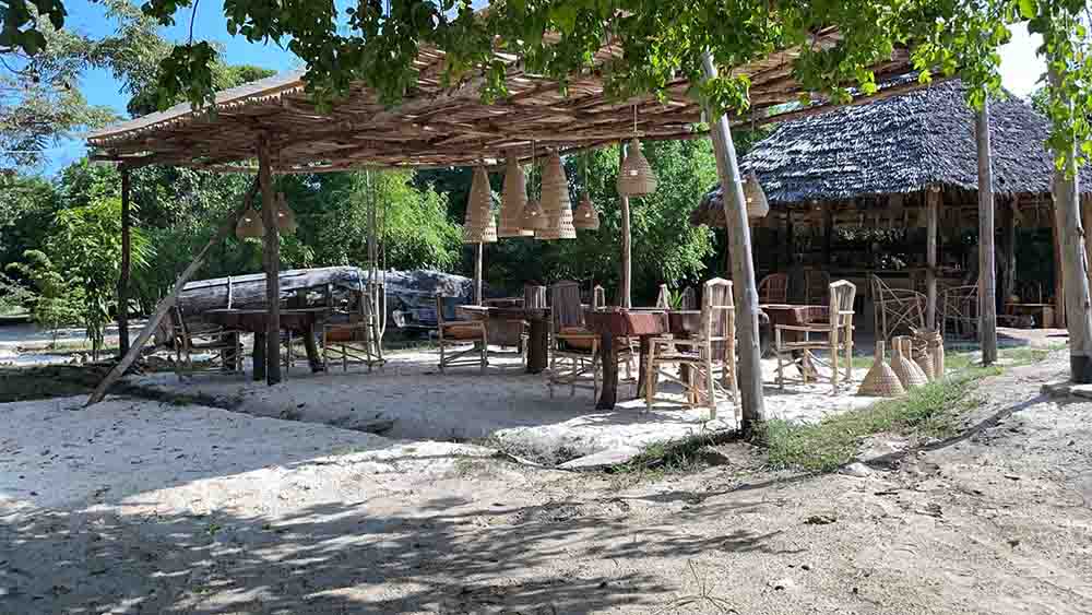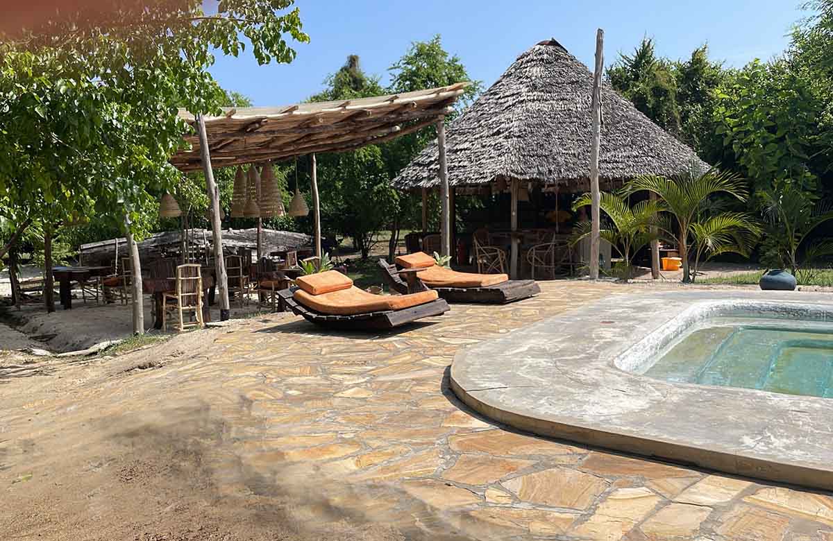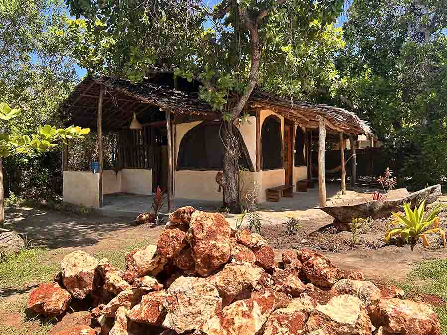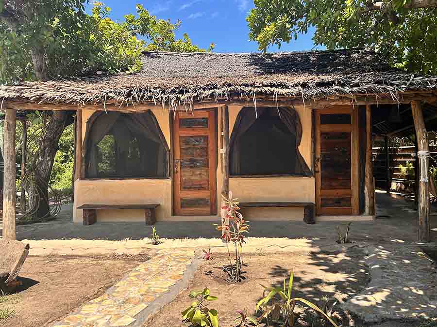 Outside terrace and garden of budget rooms made with natural materials in Kwa Simba accommodation in Pangani, Tanzania Africa.