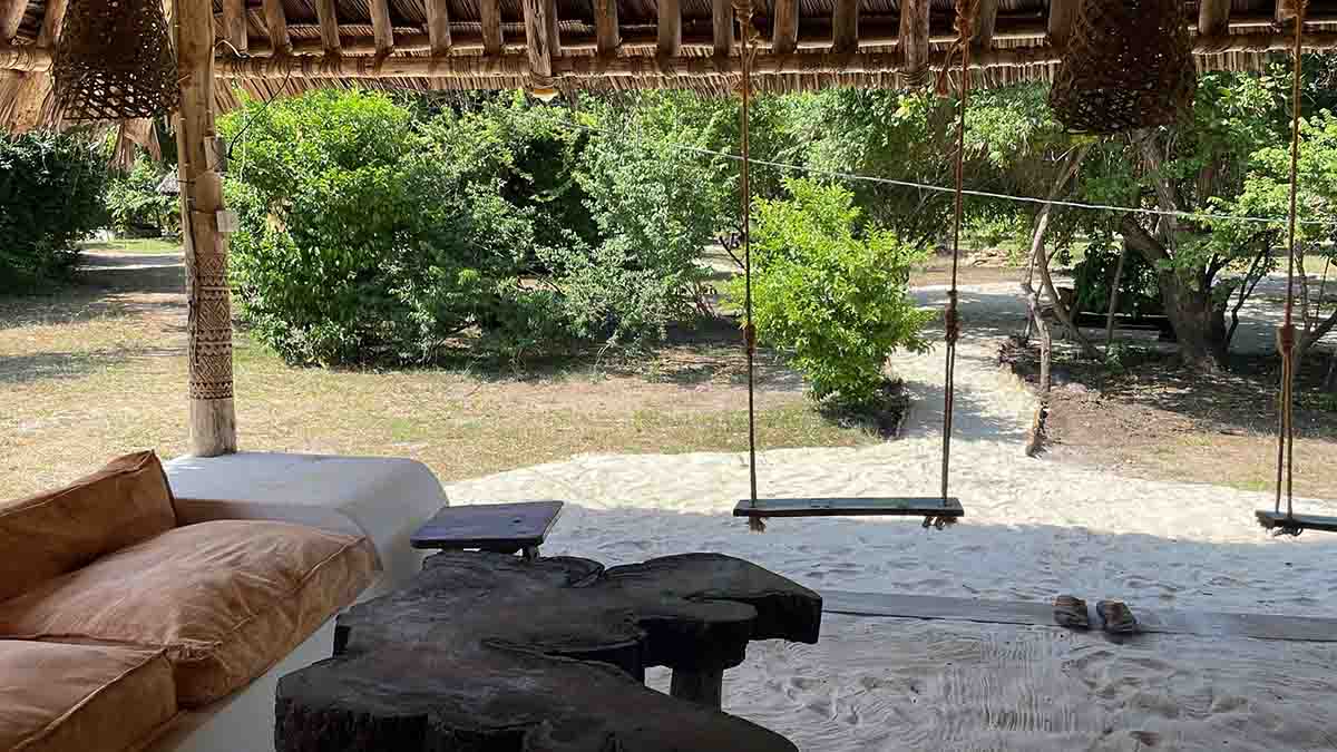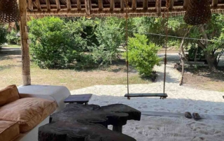 garden bungalows with roof of dried palm leaves, swings and hammock on terrace surrounded by trees